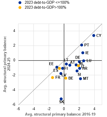 a) Cumulative sovereign debt issuance in the euro area, by maturity at origination | b) Past and projected structural primary balances across euro area countries |