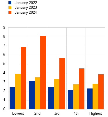 Pockets of vulnerability remain, as high interest rates weigh on the debt servicing capacity of vulnerable households and firms. High debt service costs could prove especially challenging for firms with lower credit ratings, as reflected by the rise in expected default frequencies in the high-yield segment. Expected default rates are also highly uneven across economic sectors, with firms operating in wholesale trade or in real estate seeing some of the largest increases in expected default rates (Chart 4, panel b). Defaults could rise if yields remain high, energy prices soar again or global supply chain disruptions intensify. Euro area households, especially those with lower incomes and in countries with mainly floating-rate mortgage lending, are being relatively more challenged by higher interest rates (Chart 4, panel c). However, middle-income households may be affected too, especially if labour market conditions were to weaken considerably. In such a scenario the implications for banks mortgage portfolios could become notable.