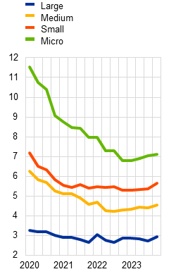 We define the interest coverage ratio as earnings before interest, depreciation and amortisation (EBITDA) plus cash and cash equivalents, divided by annual interest payments. This indicator measures the ability of firms to meet interest payments in the next 12 months and does not capture firms’ vulnerability over a longer horizon. The ICR decreases when a firm’s capacity to service its debt weakens. The ICR is correlated with other measures of a firm’s financial distress; see the box entitled “Corporate vulnerabilities and the risks of lower growth and higher rates”, Financial Stability Review, ECB, November 2023. Firms that cannot service their debt may adjust by reducing investment outlays or personnel costs, or selling assets, meaning that an ICR below 1 does not necessarily lead to them defaulting on their debt.