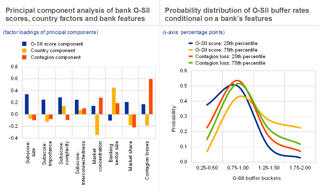 Judgements exercised by national authorities in the euro area are already implicitly taking some of these elements into account. The European Systemic Risk Board has documented the wide dispersion of O-SII capital buffers, and of the O-SII designation practices.[13] To show that this variation may be explained by potential contagion generated by O-SIIs, principal component analysis has been applied to O-SII scores and other indicators of systemic relevance of 108 euro area O-SIIs to identify common trends. The resulting principal components were then used as predictors of the O-SII buffer rates in an ordered probit set-up. The first principal component, capturing the O-SII score, and the component corresponding to contagion losses (see Chart B.4, left panel) are found to be statistically significant in these regressions. The impact of contagion losses on the setting of buffer rates is positive, although their weight is much lower than that of O-SII scores. For example, the probability that an O-SII would receive a buffer rate of 1.75% or 2.0% increases by about 5 percentage points when the systemic LGD moves from the 25th to the 75th percentile of the distribution (see Chart B.4, right panel). It also confirms that contagion losses provide fresh information to policymakers, which is not embedded in the O-SII score.