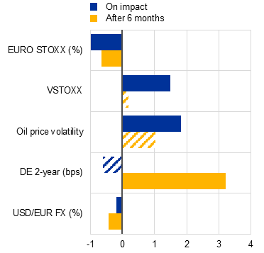 Financial market volatility may prompt investors to reduce the weight of riskier assets in their portfolios and potentially engage in flight-to-safety behaviour. Econometric estimates suggest that initially yields on risky assets go up (as reflected in widening corporate bond spreads) while those on safe assets, such as German sovereign bonds, go down in response to a geopolitical shock (Chart A.2, panel b). This is consistent with flight-to-safety behaviour, as also seen in the appreciation of the US dollar in response to rising geopolitical risk, which is consistent with its role as a safe-haven currency.