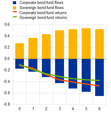 Corporate bond funds are directly affected and experience both strong outflows and lower returns when geopolitical risk rises. Interest rates on sovereign bonds fall mildly on impact, while corporate bond spreads tend to rise, pointing to reduced risk appetite in financial markets (Chart A.4, panel a). Bond yields tend to rise in the months following a shock, implying that financing conditions are deteriorating for both firms and governments (Chart A.2, panel b). Returns on both corporate and sovereign bond funds fall in the wake of a geopolitical shock because of the asset valuation losses caused by the shock (Chart A.4, panel b). Specifically, a 1 standard deviation shock decreases the returns of corporate and sovereign bond funds by almost 0.5 percentage points and 0.4 percentage points respectively after six months. At the same time, investors persistently withdraw from corporate bond funds, potentially forcing fund managers to sell assets.