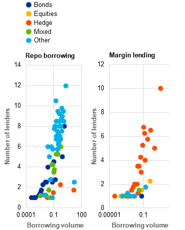 Notes: Panel a) amounts in EUR billions, full bars for euro area counterparties, lighter bars for non-euro area ones; repo borrowing and margin loans are aggregated. Intragroup transactions are excluded. The sectoral classification follows Lenoci and Letizia (2019). Panel b) shows approximately 300 funds domiciled in the euro area. Leverage ratios of margin and repo borrowing are calculated as borrowing over net asset values. Each data point represents the average leverage ratio and net asset value of a group of four funds, grouped by net asset value size.