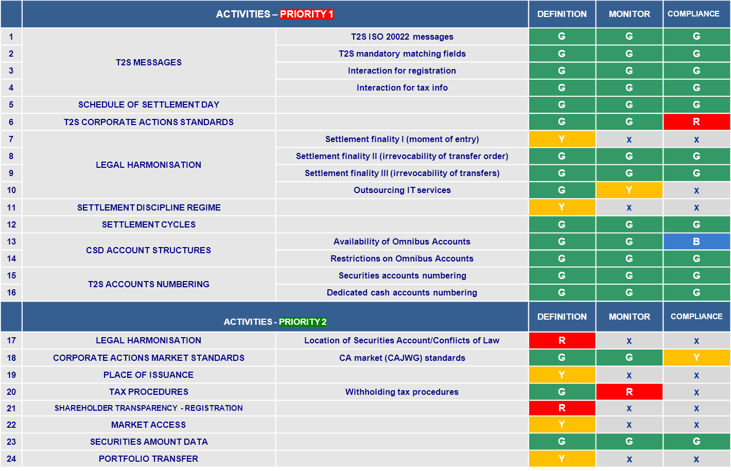 Contributing to post-trade harmonisation is a critical objective of T2S in view of the further integration of financial markets in Europe. In 2014 the T2S Advisory Group (AG) continued working towards the creation of a single rulebook for post-trade activities (messaging protocols, legal rules, operating hours, corporate actions, etc.) across the 21 T2S markets covering the 24 CSDs which will connect to T2S. Table 3 shows the progress made in relation to the identified T2S harmonisation activities. It shows, for each of the 24 T2S harmonisation activities, the progress made towards achieving the following three objectives: the definition of a T2S standard, the launch of a monitoring process for assessing the level of compliance of T2S markets, and the actual compliance level observed at this stage.
