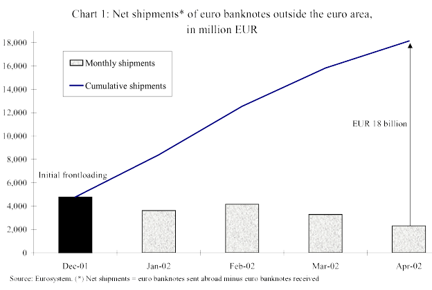Consider banknotes first. Cumulated net shipments by banks of euro banknotes to destinations outside the euro area were estimated end-April 2002 to be close to EUR 18 billion (Chart 1). This figure, which represents around 7 percent of the euro's total currency in circulation, is net of banknotes inflows and includes the initial amount supplied during the frontloading period in December 2001.