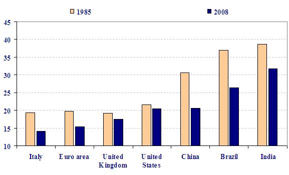 | Source: World Bank.Note: For Italy and Brazil the latest available data point is 2006. |