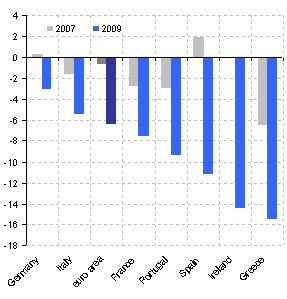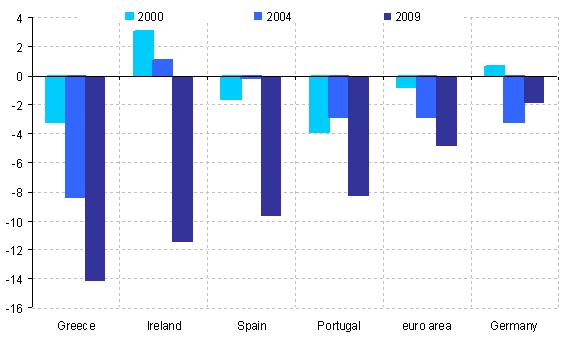 Such unbalanced growth also had important consequences for the fiscal accounts (Chart 9). The housing boom (and its positive impact on broader economic activity and spending) increased tax revenues, dramatically in some cases. These ‘windfall’ increases in tax revenue were treated as structural rather than cyclical in nature, as the housing boom was prolonged and appeared to survive the cyclical weakness in activity in mid-decade. [4] In Greece, tax windfalls allowed successive governments to obscure a fundamental weakness in the fiscal system, which was only later revealed when the public accounts statistics were improved. In Ireland, the windfalls supported the implementation of a pro-cyclical fiscal policy, as governments used revenue strength to justify tax reductions and higher public spending. Massive implicit liabilities towards the financial sector were accumulated as banking sectors grew rapidly.