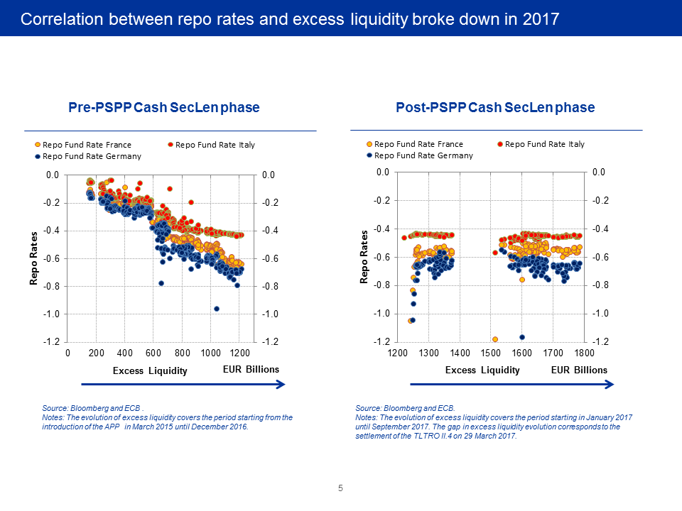 The price effects of this decision can be seen on the next slide. Before we accepted cash as collateral, there was a strong positive relationship between the level of excess liquidity and repo rates, not only for trades backed by German collateral, but also for those involving French and, to a lesser extent, Italian securities. The moment we amended our securities lending facility in December last year, the relationship broke down, as you can see on the right-hand side.