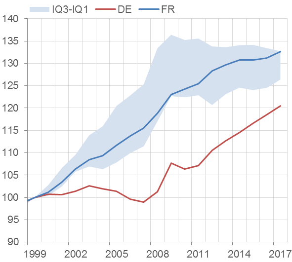 Macroeconomic imbalances in the euro area can also be attributed to factors other than the financial cycle, such as durably diverging competitiveness positions. The importance of such economic factors already featured prominently in the theory of optimal currency areas, as pioneered by Mundell in 1961. Competitiveness imbalances are one of the most visible symptoms of insufficient macroeconomic adjustment mechanisms in the euro area.[14] Developments in Germany and France – two countries which together represent nearly half of euro area GDP, and have seen broadly similar movements in GDP and prices (see Charts 7 and 8) since the start of Monetary Union – are instructive in this regard.