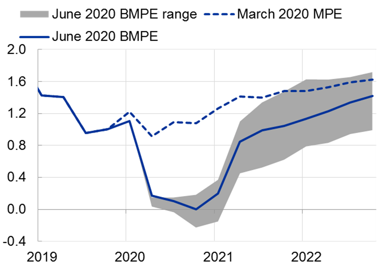 Quelle: EZB. Anmerkungen: (B)MPE = (Broad) Macroeconomic Projection Exercise. Die grau schaffierte Fläche zeigt die Spanne der Schätzungen, die einen milderen und einen schwereren Verlauf der Krise abdecken.