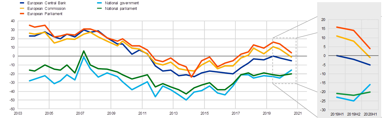 Nettovertrauen in europäische und nationale Institutionen.