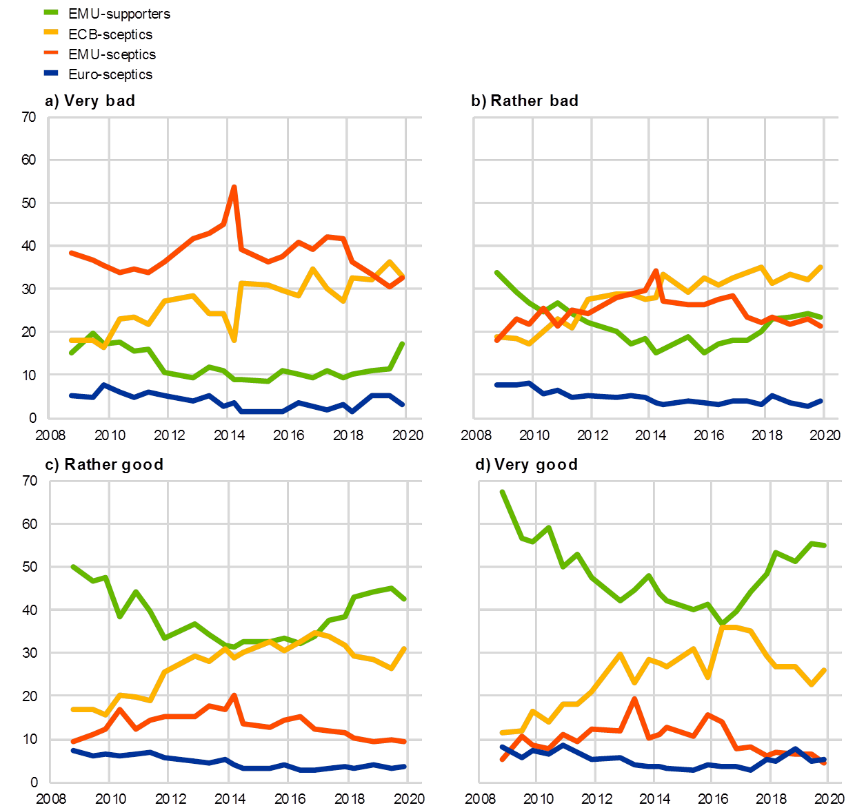 Die Länderanalyse liefert erste Anhaltspunkte, dass die wirtschaftliche Lage die Einstellung der Bürgerinnen und Bürger gegenüber der Währungsunion beeinflusst. Die Betrachtung individueller sozioökonomischer Charakteristika bestätigt diese Vermutung: es lässt sich anhand der Umfragedaten feststellen, dass Bürgerinnen und Bürger, die die gegenwärtige Wirtschaftslage in Europa positiver einschätzen, in stärkerem Maß die Währungsunion befürworten (Abbildung 5). In der Gruppe der Befragten, die die Wirtschaftslage zum Zeitpunkt der Befragung in Europa als ziemlich gut oder sehr gut einschätzen, sind die Währungsunions-Befürworter klar in der Mehrzahl. Bei denjenigen, die die Wirtschaftslage sehr schlecht einschätzen, sind hingegen die Währungsunions-Skeptiker die größte Gruppe. Die EZB-Skeptiker haben in allen vier Gruppen über die Zeit zugenommen.