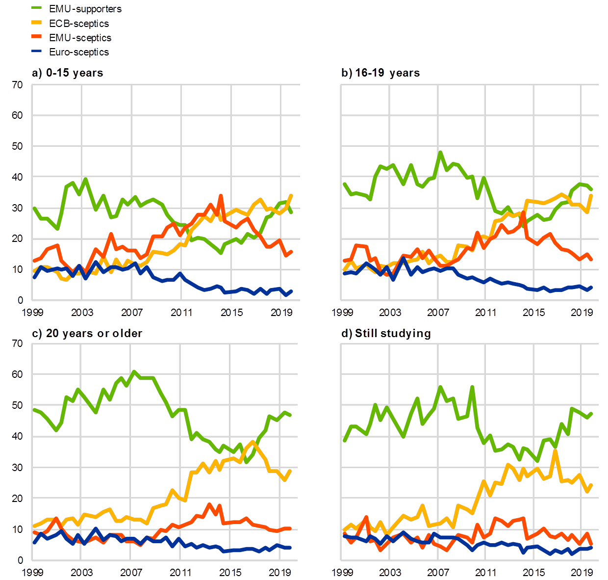 Anmerkung: Die Typologie umfasst vier Gruppen: Die erste Gruppe befürwortet weder den Euro noch zeigt sie Vertrauen in die EZB (Währungsunions-Skeptiker). Die zweite Gruppe befürwortet den Euro, vertraut hingegen der EZB nicht (EZB-Skeptiker). Die dritte Gruppe befürwortet den Euro nicht, zeigt aber Vertrauen in die EZB (Euro-Skeptiker). Die vierte Gruppe befürwortet den Euro und vertraut der EZB (Währungsunions-Befürworter). Eine fünfte Gruppe (Sonstige) umfasst diejenigen, die eine der beiden Fragen mit „weiß nicht“ beantwortet haben. Die Kategorien ergeben sich aus der Antwort auf die Frage: „Wie alt waren Sie, als Sie Ihre Vollzeitbildung beendeten?“.