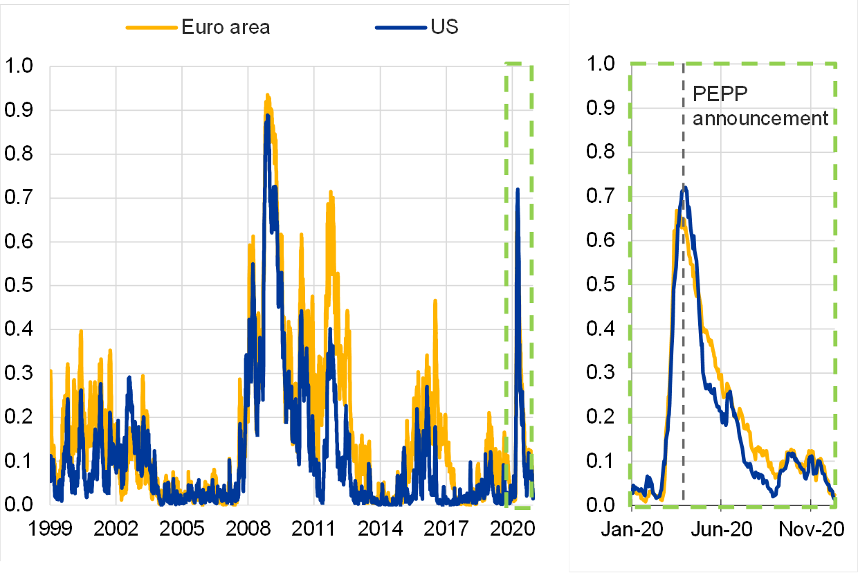 Zu Beginn der Pandemie sah sich die EZB mit einer sich dramatisch zuspitzenden Lage an den Finanzmärkten konfrontiert. Die Unsicherheit nahm rapide zu und veranlasste Marktteilnehmer, sich innerhalb kurzer Zeit aus risikoreicheren Anlageklassen zurückzuziehen. Die Risikoprämien in vielen Marktsegmenten stiegen drastisch an und die Finanzierungsbedingungen an den Finanzmärkten verschlechterten sich zunehmend. Das entschiedene und zügige Eingreifen der EZB beruhigte die Lage jedoch innerhalb kurzer Zeit. Der von der EZB verwendete Indikator für Finanzmarktstress (CISS) deutet darauf hin, dass die EZB im Frühjahr 2020 eine schwere Finanzmarktkrise verhindert hat (Abbildung 9).