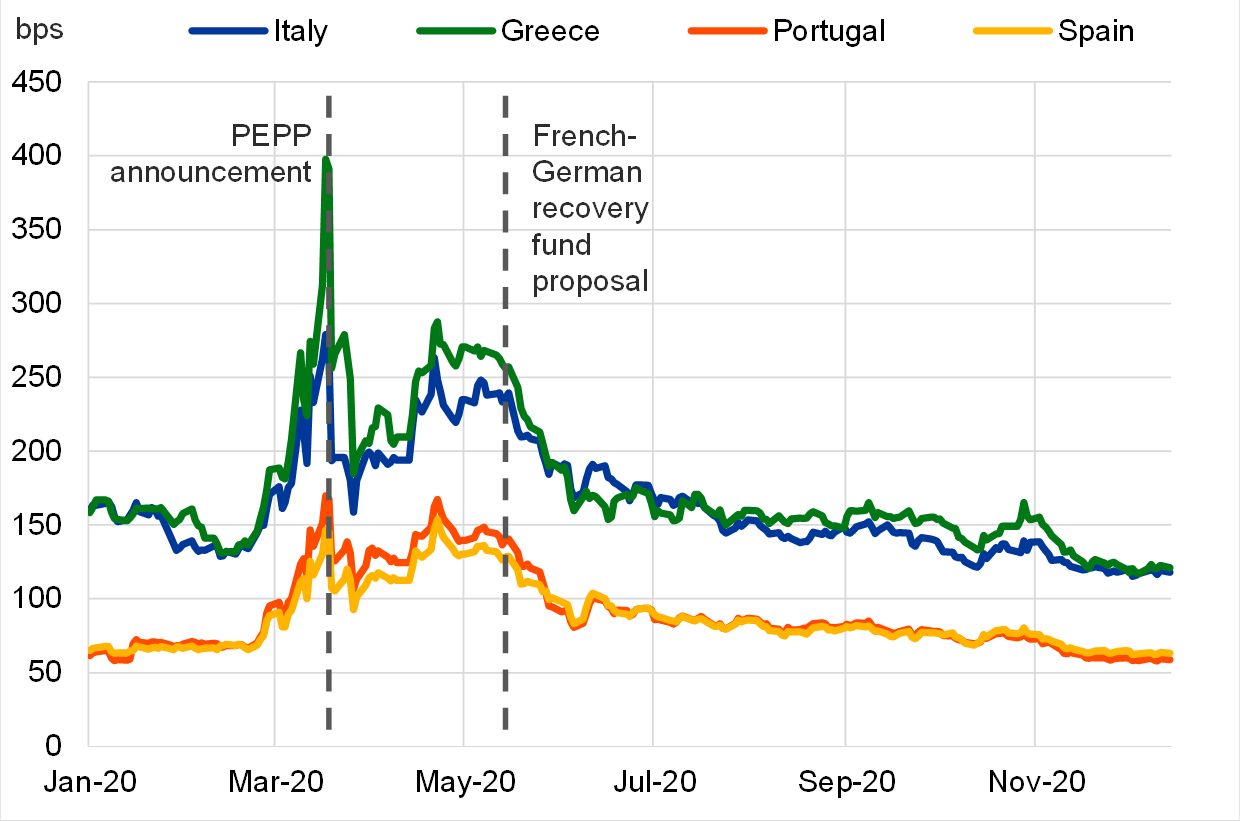 Ergänzend zu den Maßnahmen der EZB und zu nationalen fiskalischen Hilfsprogrammen wurden auf europäischer Ebene umfangreiche Maßnahmen beschlossen, um Staaten, Firmen und Arbeitnehmer während der Pandemie finanziell zu unterstützen. Im Juli entschieden die europäischen Staats- und Regierungschefs, den mehrjährigen EU-Haushalt ab 2021 für eine Dauer von sechs Jahren um 750 Milliarden Euro aufzustocken, um langfristige Investitionen und Strukturreformen in den EU-Mitgliedstaaten zu ermöglichen. Diese Krisenmaßnahmen auf europäischer Ebene haben maßgeblich zur Beruhigung der Finanzmärkte beigetragen.