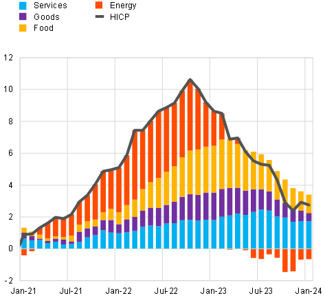 The latest observations are for January 2024 (flash) for food, energy and goods, December 2023 for the rest. Missing data points for January 2024 will become available with the HICP release on 22 February 2024.