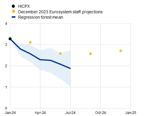 Notes: Cut-off date for the random forest is 1 February 2024. Consensus Economics data were collected on 8 January 2024. Random forest estimates are from Lenza, M., Moutachaker, I. and Paredes, J. (2023), “Forecasting euro area inflation with machine learning models”, Research Bulletin, No 112, ECB and Lenza, M., Moutachaker, I. and Paredes, J. (2023), “Density forecasts of inflation: a quantile regression forest approach”, Working Paper Series, No 2830, ECB. The shadowed area shows the 5-95th confidence interval of the regression forest forecast. The latest observations are for January 2024 (flash).