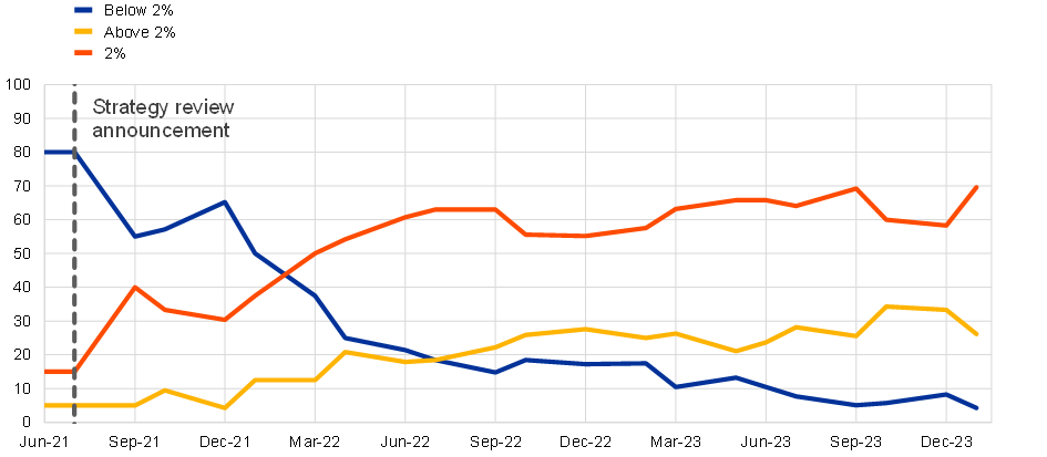 The December 2023 Eurosystem staff projections see inflation stabilising around the two per cent target from about the middle of 2025 onwards. The incoming data suggest that the process of disinflation in the near term in fact may run faster than previously expected, although the implications for medium-term inflation are less clear. At the same time, the strength of the recovery of the economy, the path of fiscal policies, wage developments, and the degree to which firms absorb higher input costs, all in a context of continued heightened geopolitical uncertainty, will have an important bearing on the inflation trajectory. The March 2024 ECB staff macroeconomic projections will provide the opportunity for a comprehensive update of our medium-term inflation outlook.
