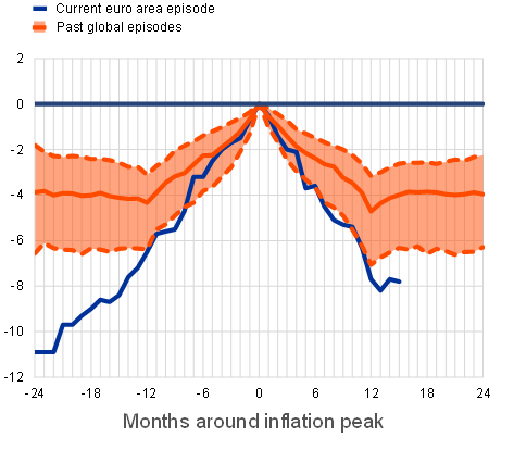 Notes: The shaded areas and the orange and yellow lines represent respectively the interquartile range and the median of national headline and core inflation series relative to their peaks during disinflation episodes before 2022 across a panel of 30 advanced economies and 28 emerging market economies. Month = 0 when the headline inflation rate is at its highest during that particular episode. The dark blue line represents the latest developments in headline and core inflation for the euro area, relative to the October 2022 peak. The latest observations are for January 2024.