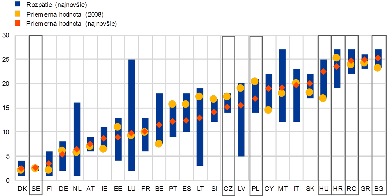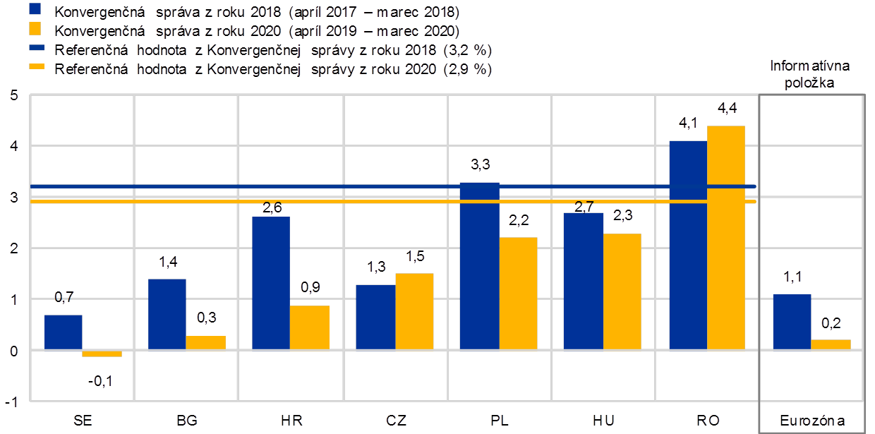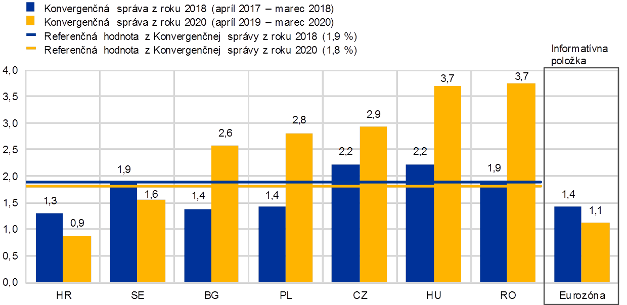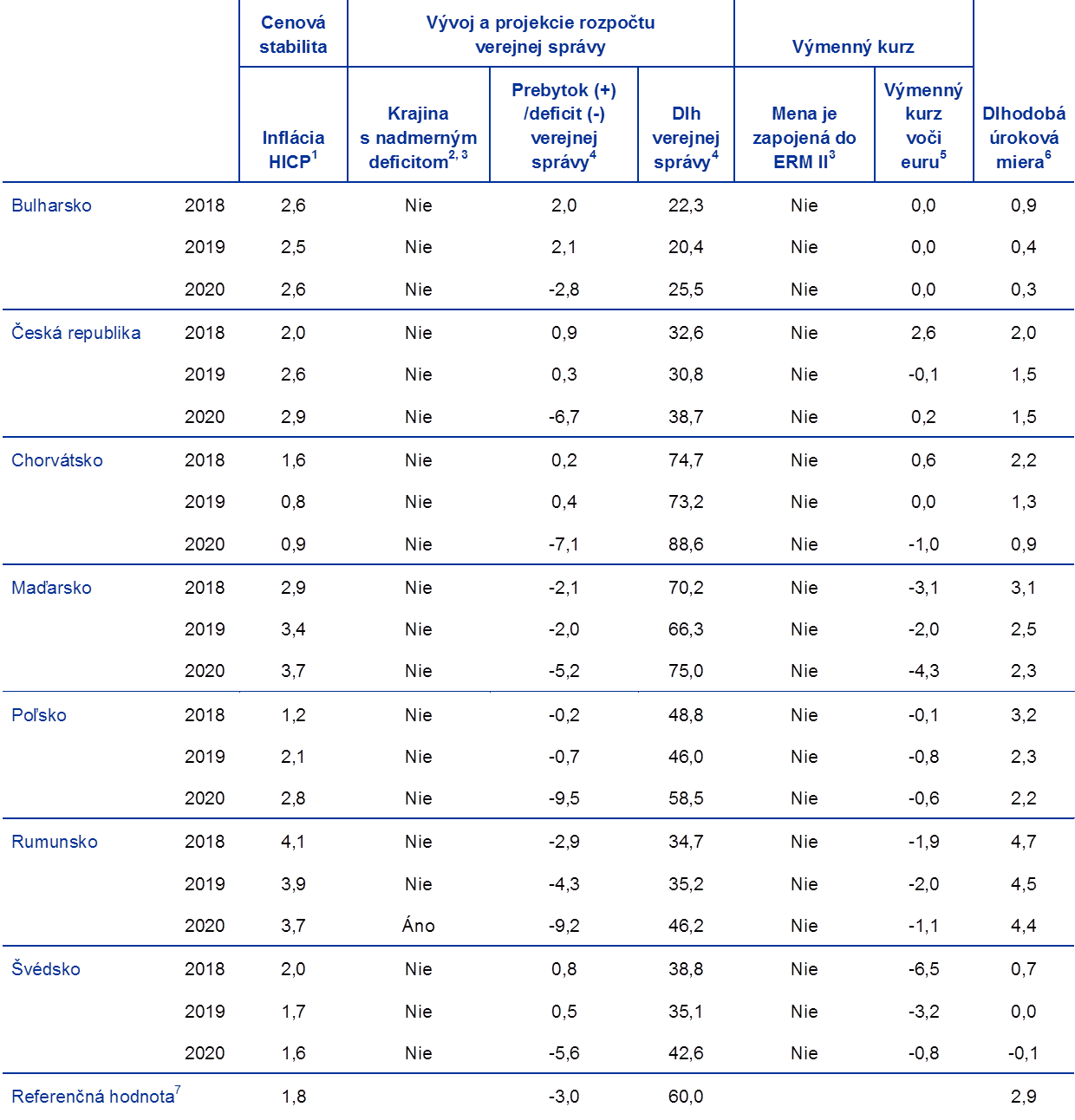 Vplyv pandémie koronavírusu (COVID-19) na hodnotenie konvergencie sa v tejto konvergenčnej správe zohľadňuje len okrajovo. Keďže je príliš skoro na odvodenie spoľahlivých záverov o tomto vplyve na priebeh konvergencie, a či sa v príslušných krajinách prejaví symetricky alebo asymetricky, jeho podrobná analýza bude vypracovaná až v ďalšej konvergenčnej správe. Vo svetle pandémie COVID-19 je výhľadové hodnotenie konvergencie spojené s vysokou mierou neistoty, celkové dôsledky tak bude možné zhodnotiť len ex post. Väčšina členských štátov EÚ prijala kroky na obmedzenie šírenia nákazy a zaviedla osobitné rozpočtové, makroprudenciálne, dohľadové a menovopolitické opatrenia na zmiernenie hospodárskych následkov. V tomto štádiu nie je celkom zrejmý ani vplyv na štatistické údaje. Všetky konvergenčné kritériá sa spájajú so zvýšenou mierou neistoty. Pokiaľ ide o kritérium cenovej stability, vývoj inflácie v nadchádzajúcich mesiacoch je značne neistý. Hospodársky pokles spôsobený pandémiou COVID-19 by mohol byť oveľa zdĺhavejší, oživenie by však mohlo prísť aj oveľa skôr, ako sa pôvodne očakávalo. Značná neistota sa spája aj s rozložením rizík, pokiaľ ide o tlak na zníženie inflácie v dôsledku slabšieho dopytu a tlak na jej zvýšenie vzhľadom na výpadky na strane ponuky. Z hľadiska fiškálneho kritéria má pandémia COVID-19 dosah tiež na výhľad verejných financií, no kľúčové fiškálne ukazovatele za roky 2010 až 2019 neboli ovplyvnené. Pokiaľ ide o fiškálny výhľad, analýza ECB vychádza hlavne z hospodárskej prognózy Európskej komisie z jari 2020, v ktorej sa poukazuje na prudké zhoršenie salda verejných financií vo všetkých krajinách v dôsledku výrazného zhoršenia hospodárskej aktivity a fiškálnych opatrení prijatých na zmiernenie krízy. Vzhľadom na vysokú mieru neistoty sa však nezohľadnil potenciálny vplyv pandémie na strednodobú až dlhodobú udržateľnosť rozpočtových pozícií nad rámec dosahu zachyteného v posledných prognózach. Analýza ECB sa konkrétne opiera o Monitor udržateľnosti dlhovej služby za rok 2019 vypracovaný Európskou komisiou, ktorý bol zverejnený pred vypuknutím pandémie COVID-19. Po vypuknutí nákazy COVID-19 začala narastať volatilita výmenných kurzov a tlak na oslabenie národných mien voči euru. Aby sa predišlo skresleniu celkového hodnotenia konvergencie, obdobie preskúmania vývoja výmenných kurzov sa končí v marci 2020. Pokiaľ ide o vývoj dlhodobých úrokových mier, pre dosah pandémie na finančné trhy nie je v analýze zahrnutý apríl 2020. Extrémna neistota a volatilita na finančných trhoch môžu zakrývať podstatu informácií o ich vývoji, a preto môže dôjsť k skresleniu celkového hodnotenia pokroku v konvergencii jednotlivých krajín. V konečnom dôsledku tak riadnu analýzu vplyvu hospodárskych dôsledkov pandémie na hodnotenie konvergencie možno vykonať len spätne.
