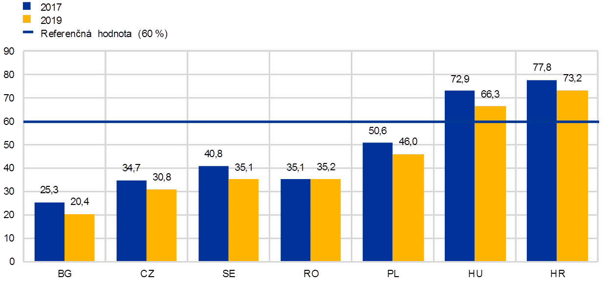 Čo sa týka ustanovenia zmluvy, podľa ktorého sa pomer dlhu prevyšujúci 60 % HDP má „dostatočne znižovať a uspokojujúcim tempom približovať k referenčnej hodnote“, ECB hodnotí predchádzajúci a budúci trend tohto pomeru. V prípade členských štátov, ktorých pomer dlhu prekračuje túto referenčnú hodnotu, ECB použije posledné hodnotenie Európskej komisie o dodržiavaní referenčnej hodnoty pre zníženie dlhu stanovenej v článku 2 ods. 1a nariadenia (ES) č. 1467/97.