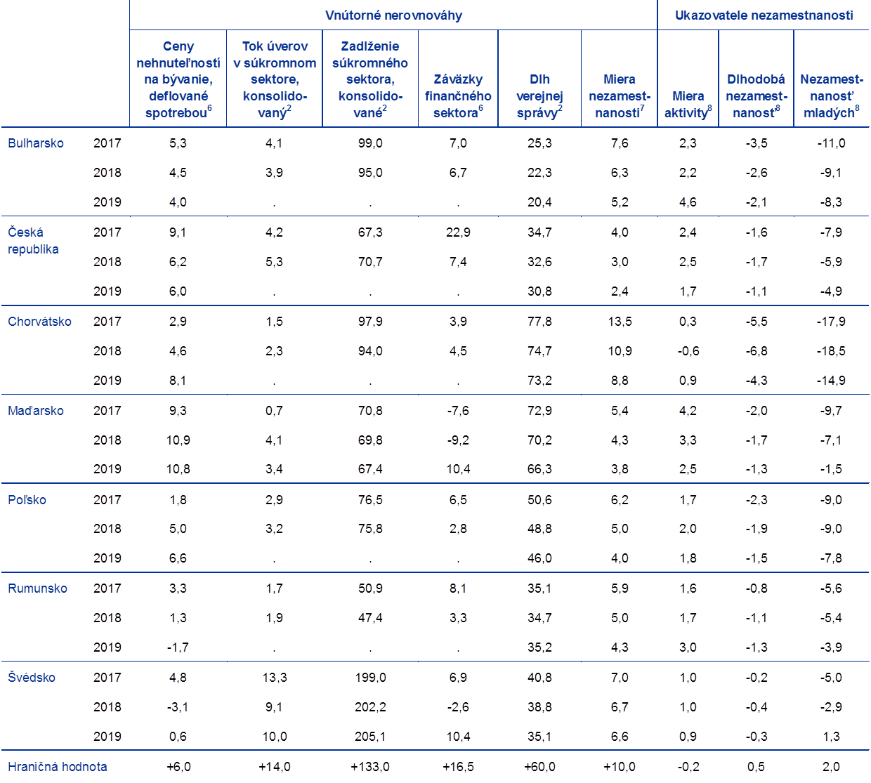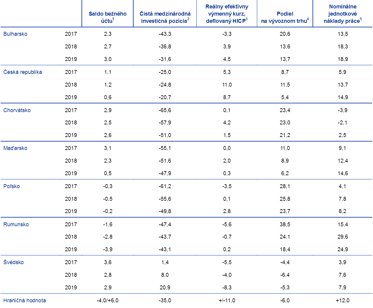 Ďalšie faktory, ktoré sa uvádzajú v článku 140 ods. 1 zmluvy, sa podobne ako v minulosti podrobne skúmajú v kapitole 5 v rámci hodnotenia jednotlivých kritérií opísaných v boxoch 1 až 4. Pre úplnosť sa v tretej kapitole uvádzajú ukazovatele hodnotiacej tabuľky (aj vo vzťahu k hraničným hodnotám pre včasné varovanie) za krajiny, ktorých sa táto správa týka. Zabezpečia sa tak všetky dostupné informácie potrebné na odhalenie makroekonomických a makrofinančných nerovnováh, ktoré môžu brániť dosiahnutiu vysokého stupňa udržateľnej konvergencie, ako sa uvádza v článku 140 ods. 1 zmluvy. Najmä členské štáty EÚ, pre ktoré platí výnimka a ktoré podliehajú postupu pri nadmernej nerovnováhe, možno len ťažko považovať za krajiny, ktoré dosiahli vysoký stupeň udržateľnej konvergencie v súlade s článkom 140 ods. 1 zmluvy.