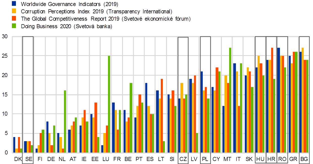 Vzhľadom na slabé stránky a komparatívne výhody inštitucionálnych ukazovateľov založených na vnímaní (napr. korupcia) a objektívnejších inštitucionálnych ukazovateľov (napr. podnikanie) sú v grafoch 3.6 a 3.7 zohľadnené oba druhy ukazovateľov.