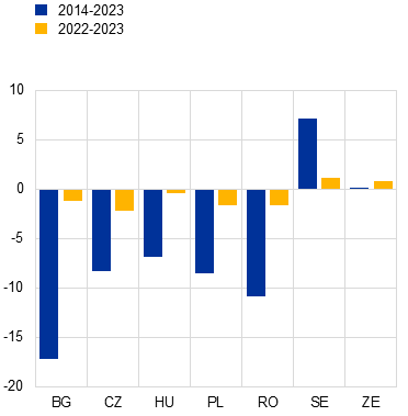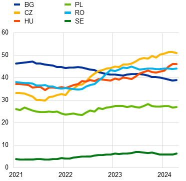 Il y a lieu de signaler que la Belgique et le Danemark pourraient également être considérés comme des exceptions puisque, en mai 2024, les taux d’inflation moyens sur douze mois dans ces deux pays étaient sensiblement inférieurs à la moyenne de la zone euro (de, respectivement, 1,5 et 2,3 points de pourcentage). Dans ces deux pays, la grande différence en termes de dynamique de l’inflation par rapport à la zone euro s’explique principalement par des replis plus importants de la composante énergétique de l’IPCH, en raison d’une répercussion plus rapide des prix de gros sur les prix de détail de l’énergie, ce qui reflète principalement les caractéristiques spécifiques des contrats d’énergie.