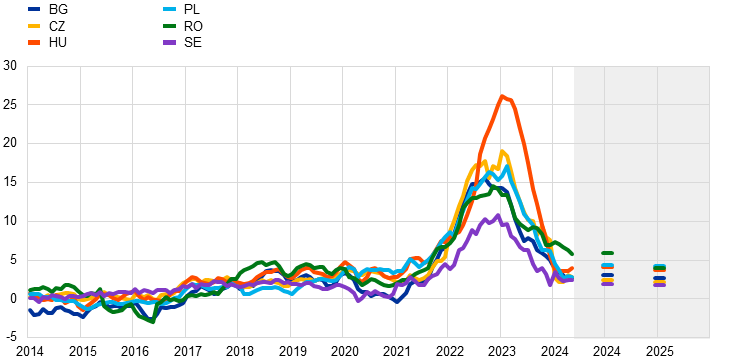 Le taux d’inflation moyen mesuré par l’IPCH au cours de la période de référence de douze mois allant de juin 2023 à mai 2024 est analysé à la lumière des résultats économiques du pays examiné en termes de stabilité des prix au cours des dix dernières années. Cela permet une analyse plus approfondie du caractère durable de l’évolution des prix dans ce pays. À cet égard, on prend en considération l’orientation de la politique monétaire, en examinant en particulier si la priorité des autorités monétaires a été la réalisation et le maintien de la stabilité des prix, et la contribution d’autres pans de la politique économique à cet objectif. De plus, les effets de l’environnement macroéconomique sur la réalisation de la stabilité des prix sont pris en considération. L’évolution des prix est étudiée en tenant compte des conditions d’offre et de demande et, notamment, des facteurs tels que les coûts unitaires de main-d’œuvre et les prix à l’importation. Enfin, les profils d’évolution d’autres indices des prix pertinents sont examinés. Dans une optique prospective, une analyse de l’évolution des prix pour les prochaines années, qui comprend les prévisions des grandes organisations internationales et des intervenants de marché, est présentée. En outre, les aspects institutionnels et structurels nécessaires au maintien d’un environnement propice à la stabilité des prix après l’adoption de l’euro sont évoqués.