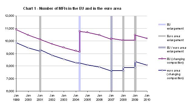 - Despite the enlargement of the euro area through the accession of Greece (2001), Slovenia (2007), Cyprus and Malta (both 2008) as well as Slovakia (2009), the number of MFIs in the euro area has decreased by 18.1% or 1,780 institutions since 1 January 1999. On 1 January 2010, Germany and France accounted for 41.1% of all euro area MFIs, a share broadly unchanged from that recorded on 1 January 2009.