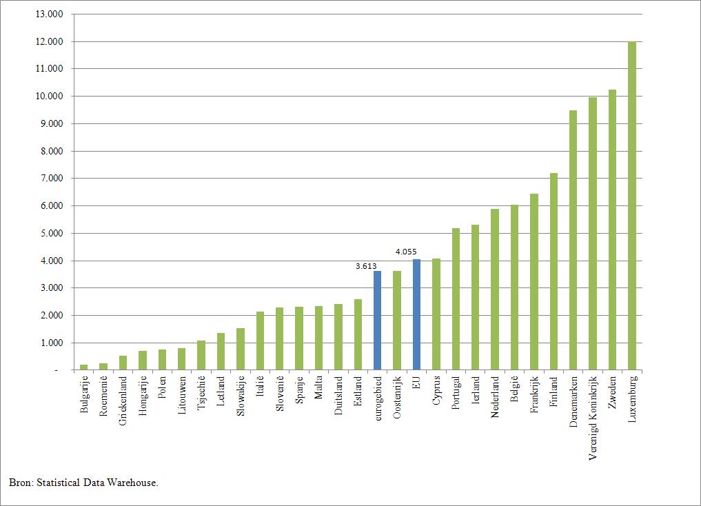 Grafiek 3: Totale waarde (in euro) van kaartbetalingen per inwoner en per jaar (2012)