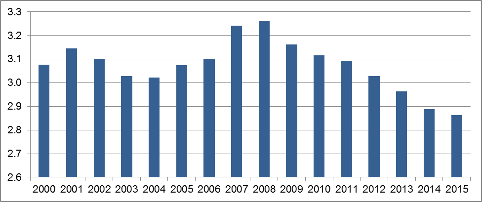 The structural financial indicators show, for instance, that in most EU Member States the number of branches of domestic credit institutions has continued to decline. The number of employees of credit institutions in the EU has also fallen, to around 2.86 million in 2015, a decrease of some 24,000 compared with the figure for 2014. The number has been steadily decreasing since 2008.
