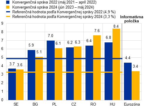 Pokiaľ ide o kritérium cenovej stability, päť hodnotených krajín – Bulharsko, Česká republika, Maďarsko, Poľsko a Rumunsko – zaznamenalo priemernú mieru inflácie výrazne nad referenčnou hodnotou 3,3 %, pričom vo Švédsku bola inflácia mierne nad referenčnou hodnotou (graf 1). Referenčná hodnota je založená na troch členských štátoch s najlepšími výsledkami za posledných 12 mesiacov, ktorými sú Dánsko (1,1 %), Belgicko (1,9 %) a Holandsko (2,5 %), pričom do úvahy sa berie priemerná miera inflácie za posledných 12 mesiacov, ku ktorej sa pripočíta 1,5 percentuálneho bodu. Z tohto výpočtu bola vylúčená jedna mimoriadna hodnota, a to za Fínsko.