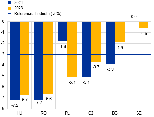 Rozpočtový deficit sa v roku 2023 v štyroch krajinách hodnotených v tejto správe v porovnaní s úrovňou z roku 2021 zlepšil v dôsledku hospodárskeho oživenia po pandémii a ukončovania podporných rozpočtových opatrení. Toto zlepšenie však čiastočne obmedzil hospodársky vplyv ruskej vojny proti Ukrajine vrátane slabšej hospodárskej aktivity a rozpočtových opatrení prijatých v reakcii na vysoké ceny energií. Česká republika, Maďarsko, Poľsko a Rumunsko prekročili v roku 2023 referenčnú hodnotu deficitu vo výške 3 % HDP (graf 2). Pomer dlhu verejnej správy k HDP bol v roku 2023 pod referenčnou hodnotou (60 %) vo všetkých hodnotených krajinách okrem Maďarska. Očakáva sa, že v rokoch 2024 a 2025 bude rozpočtové saldo v Maďarsku, Poľsku a Rumunsku naďalej prekračovať referenčnú hodnotu.