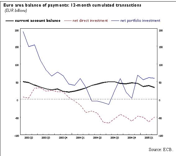 The 12-month cumulated surplus of the euro area current account up to March 2005 amounted to EUR 34.3 billion, i.e. around 0.5% of GDP, compared with EUR 32.1 billion a year earlier. This increase resulted from lower deficits in income and current transfers and a higher surplus in services, partly counterbalanced by a lower goods surplus.