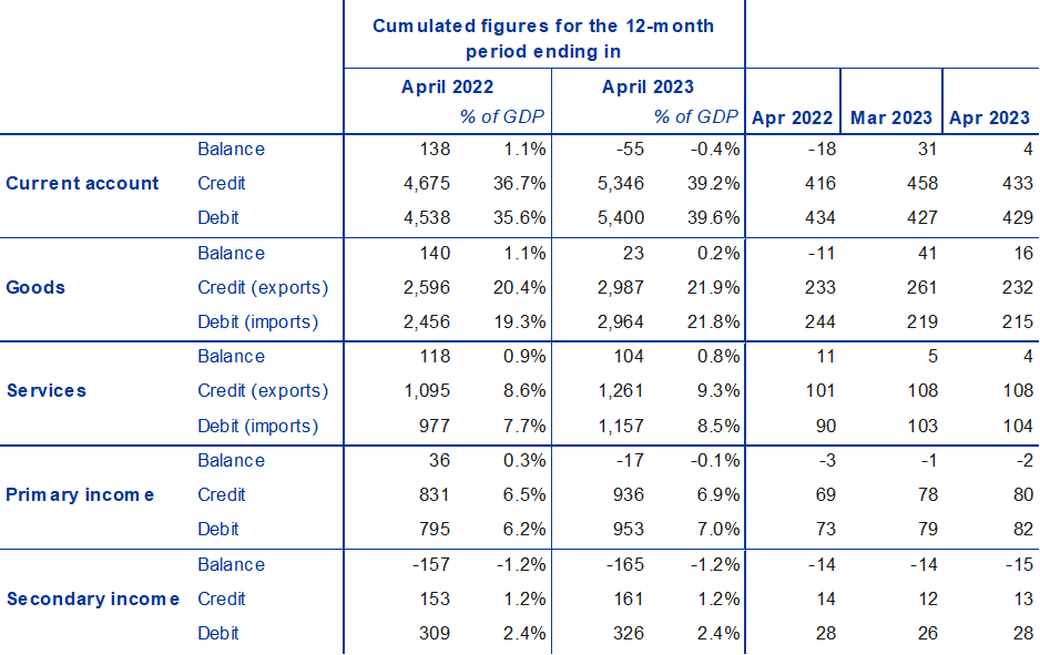 - Current account deficit amounted to €55 billion (0.4% of euro area GDP) in 12 months to April 2023, compared with a surplus of €138 billion (1.1% of euro area GDP) one year earlier