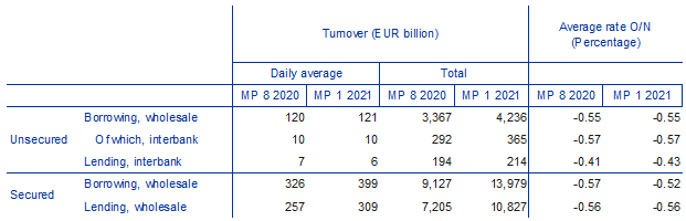 - Daily average borrowing turnover in the unsecured segment increased from €120 billion in the eighth maintenance period of 2020 to €121 billion in the first maintenance period of 2021