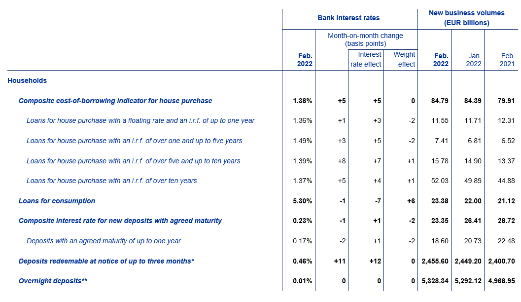 The composite cost-of-borrowing indicator, which combines interest rates on all loans to households for house purchase, increased, driven by the interest rate effect in February 2022. The interest rate on loans for house purchase with a floating rate and an initial rate fixation period of up to one year and the one on housing loans with an initial rate fixation period of over one and up to five years remained broadly unchanged at 1.36% and 1.49%, respectively. The rate on loans for house purchase with an initial rate fixation period of over five and up to ten years increased by 8 basis points to 1.39%, driven by the interest rate effect. The rate on housing loans with an initial rate fixation period of over ten years increased by 5 basis points to 1.37%, driven by the interest rate effect. In the same period the interest rate on new loans to households for consumption remained broadly unchanged at 5.30%.