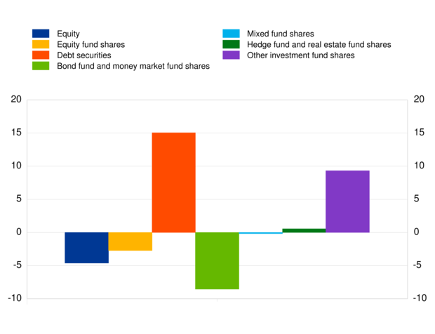 Total assets of euro area pension funds increased to €3,212 billion in the first quarter of 2023, from €3,136 billion in the fourth quarter of 2022. Investment fund shares accounted for 40.4% of the pension funds sector's total assets in the first quarter of 2023. The second largest category of holdings was debt securities (27.2%), followed by equity (11.6%) (see respective transactions in Chart 1).