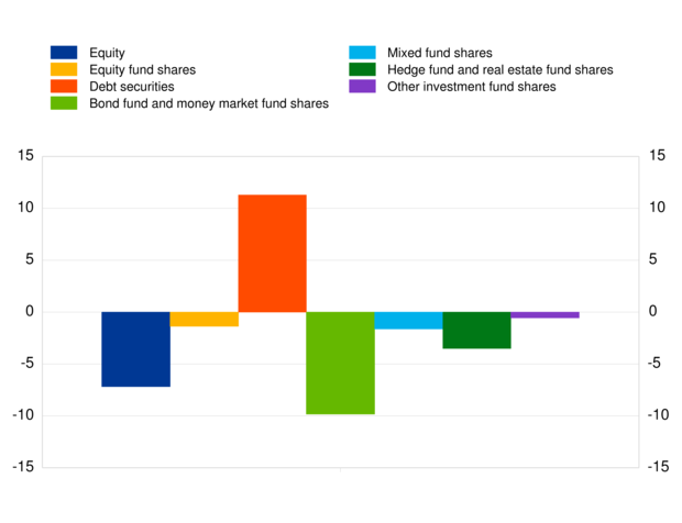 Total assets of euro area pension funds decreased to €3,229 billion in the third quarter of 2023, from €3,244 billion in the second quarter of 2023. Investment fund shares accounted for 39.7% of the pension funds sector's total assets in the third quarter of 2023. The second largest category of holdings was debt securities (26.9%), followed by equity (11.7%) (see respective transactions in Chart 1).