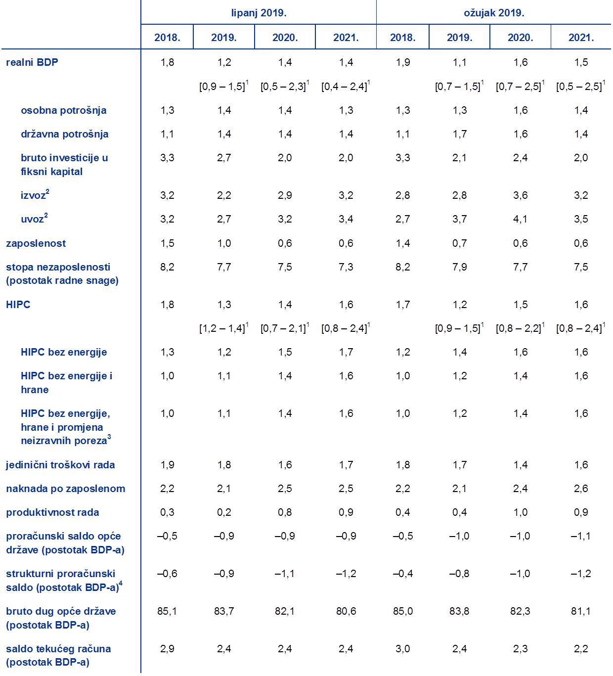 U odnosu na projekcije iz ožujka 2019. rast realnog BDP‑a revidiran je naviše za 2019., dok je za 2020. i 2021. revidiran naniže. Iznenađujuće snažan rast u prvom tromjesečju 2019. uvelike premašuje revizije naniže za ostatak godine zbog (a) slabljenja privremenih čimbenika koji su poticali rast u prvom tromjesečju, (b) slabijeg raspoloženja i revizija naniže inozemne potražnje koje uglavnom proizlaze iz dugotrajne globalne neizvjesnosti povezane s politikama (npr. Brexit i trgovinski sporovi) i (c) dugotrajne neizvjesnosti povezane s politikama u Italiji. Te revizije naniže izgleda za kratkoročno razdoblje upućuju na slabiji učinak prijenosa u 2020. Srednjoročni izgledi samo su neznatno revidirani naniže.