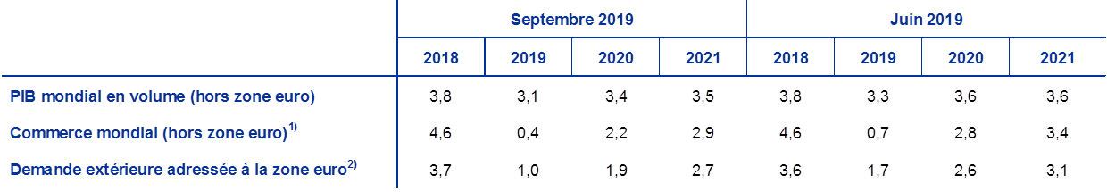 À moyen terme, la croissance de l’économie mondiale devrait se redresser et se stabiliser à un niveau inférieur à sa moyenne de long terme, de 3,8 %. Après avoir reculé de 3,8 % en 2018 à 3,1 % en 2019, la croissance mondiale (hors zone euro) devrait reprendre et se stabiliser à 3,5 % en 2021. Son évolution est déterminée par trois grands facteurs. Premièrement, la dynamique conjoncturelle observée dans les économies avancées devrait se ralentir à mesure que les contraintes de capacité se durcissent, dans un contexte d’écarts de production positifs et de faibles taux de chômage dans les grandes économies, tandis que le soutien des politiques publiques diminuerait peu à peu vers la fin de l’horizon de projection. Deuxièmement, le ralentissement progressif de l’économie chinoise et son rééquilibrage au détriment de l’investissement et en faveur de la consommation devraient avoir un effet négatif sur la croissance mondiale et sur le commerce en particulier. Troisièmement, les économies de marché émergentes (hormis la Chine) devraient, au contraire, soutenir la croissance mondiale, étant donné qu’elles se remettent de récessions antérieures et que les écarts de production négatifs se réduisent. Les perspectives de croissance mondiale sont révisées à la baisse sur l’horizon de projection par rapport aux projections de juin 2019, en raison d’une reprise moins vive qu’escompté dans certaines économies de marché émergentes et, dans une moindre mesure, des répercussions des tensions commerciales actuelles.