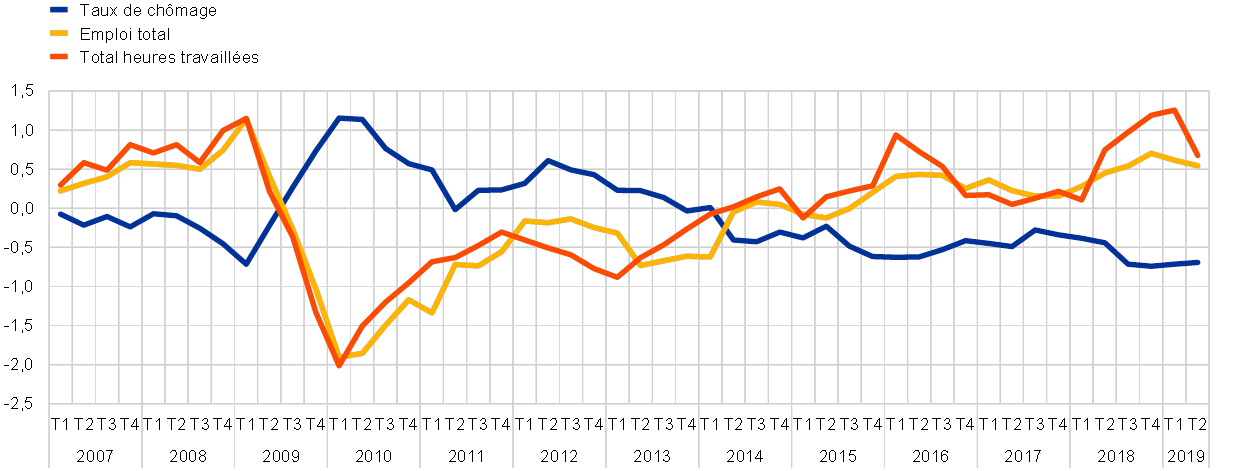 Notes : un résidu positif indique que la variable en question a atteint un niveau plus élevé que prédit par la relation d’Okun. Le graphique présente les résidus relatifs au taux de chômage et aux taux de croissance annuelle de l’emploi total et du nombre total d’heures travaillées. Les estimations reposent sur les données de la période comprise entre le premier trimestre 1998 et le deuxième trimestre 2019. Résidus d’une relation statique d’Okun qui relie les variations annuelles du taux de chômage, le taux de croissance annuel de l’emploi total et le taux de croissance annuel du nombre total d’heures travaillées au taux de croissance annuel du PIB en volume de la même période.