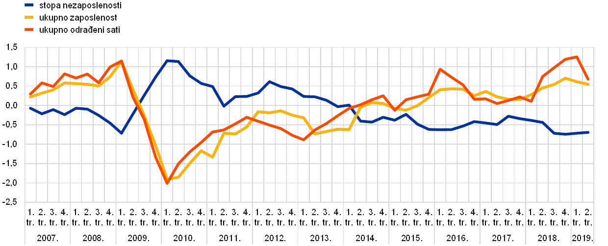 Napomene: Pozitivni rezidual pokazuje da je varijabla o kojoj je riječ dosegnula višu razinu od one koja je predviđena na temelju Okunova zakona. U grafikonu se vide reziduali koji se odnose na stopu nezaposlenosti i na godišnje stope rasta ukupne zaposlenosti i ukupnog broja odrađenih sati. Procjene se temelje na podatcima za razdoblje između prvog tromjesečja 1998. i drugog tromjesečja 2019. Riječ je o rezidualima u odnosu na statični odnos prema Okunovu zakonu, kojim se uspostavlja odnos između godišnjih promjena stope nezaposlenosti, godišnje stope rasta ukupne zaposlenosti i godišnje stope rasta ukupnih sati s jedne strane i istodobne godišnje stope rasta realnog BDP‑a s druge strane.