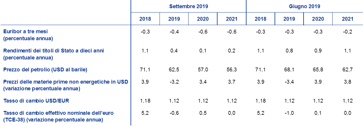 Rispetto alle proiezioni dello scorso giugno, le ipotesi tecniche includono un calo dei prezzi del petrolio e tassi di interesse significativamente più bassi. Le ipotesi tecniche concernenti i tassi di interesse e i prezzi delle materie prime sono basate sulle aspettative di mercato al 19 agosto 2019. I tassi di interesse a breve termine si riferiscono all’Euribor a tre mesi e le aspettative di mercato sono desunte dai tassi dei contratti future. Da questa metodologia deriva un livello medio dei tassi a breve del -0,4% nel 2019 e del -0,6% nel 2020 e nel 2021. Le aspettative di mercato sui rendimenti nominali dei titoli di Stato a dieci anni dell’area dell’euro implicano una media dello 0,4% per il 2019, dello 0,1% per il 2020 e dello 0,2% per il 2021[2]. Da un confronto con l’esercizio previsivo di giugno emerge che le aspettative di mercato per i tassi di interesse a breve termine sono state riviste verso il basso di circa 10 punti base per il 2019, di 30 punti base per il 2020 e di approssimativamente 40 punti base per il 2021, mentre quelle per i rendimenti nominali dei titoli di Stato a dieci anni sono state corrette al ribasso di circa 40 punti base per il 2019, di 80 punti base per il 2020 e di approssimativamente 90 punti base per il 2021.