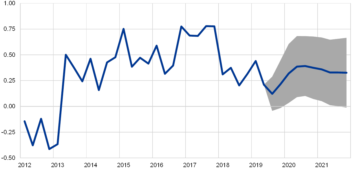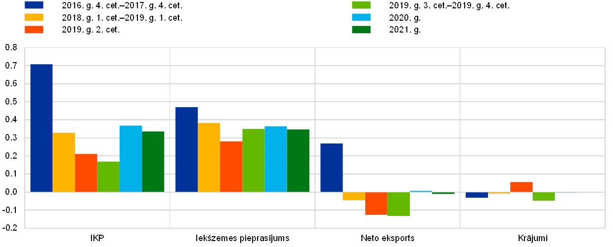 Šajā ielikumā sniegti pierādījumi attiecībā uz euro zonas iekšzemes pieprasījuma noturību pret negatīviem ārējiem šokiem. Euro zonas reālā IKP izaugsmes palēnināšanās no 2017. gada 4. ceturkšņa līdz 2019. gada 2. ceturksnim galvenokārt saistīta ar neto tirdzniecības vājināšanos, bet iekšzemes pieprasījums izaugsmes palēnināšanos ietekmēja daudz mazāk (sk. A att.). Gaidāms, ka iekšzemes pieprasījuma kāpums iespēju aplēšu periodā saglabāsies diezgan noturīgs, veicinot reālā IKP izaugsmi, bet neto eksporta devums būs neitrāls.