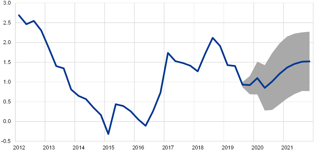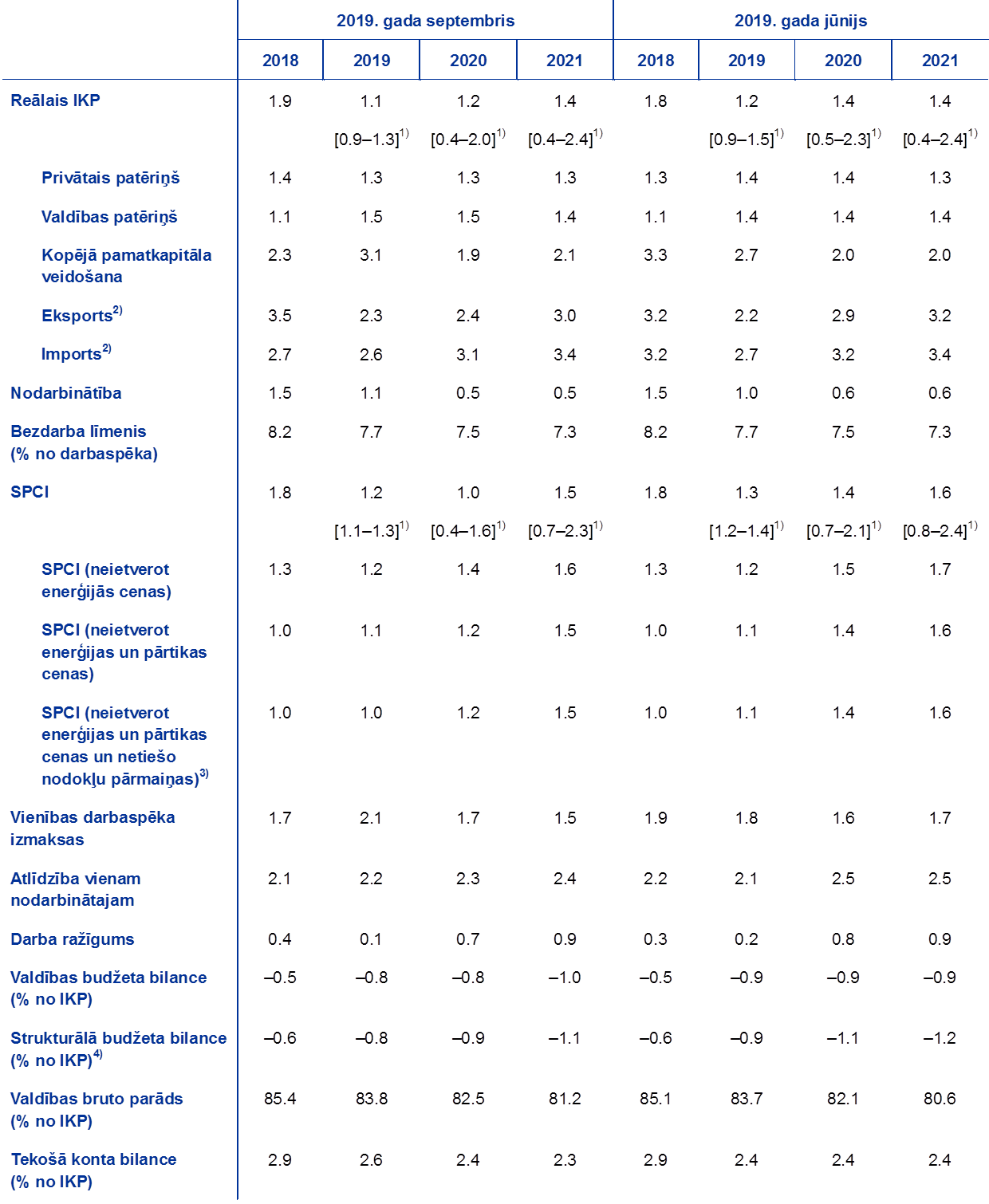 Pēc vājas izaugsmes 2019. gada 2. ceturksnī jaunākie īstermiņa rādītāji liecina, ka atveseļošanās, kas iepriekšējās iespēju aplēsēs prognozēta 2019. gada 2. pusgadā, notiks vēlāk. Ekonomiskā noskaņojuma rādītāji, īpaši rūpniecības nozarē, pēdējos mēnešos turpinājuši pasliktināties. Tas atspoguļo pastāvīgu globālās tirdzniecības pavājināšanos ilgstošas globālās nenoteiktības vidē (piemēram, protekcionisma saasināšanās, straujākas Ķīnas tautsaimniecības izaugsmes palēnināšanās iespējamības un nesakārtota breksita apstākļos). Šie faktori ietekmē uzņēmumu gaidas apstrādes rūpniecībā, un gaidāms, ka tuvākajā laikā tie turpinās ierobežot euro zonas aktivitāti. Vienlaikus noskaņojums uz iekšzemes pieprasījumu orientēto pakalpojumu un būvniecības sektorā, kā arī patērētāju konfidence joprojām bijusi noturīgāka, un situācija darba tirgū turpinājusi uzlaboties. Pamataplēsē ņemts vērā tehniskais pieņēmums par būtiski zemākām procentu likmēm, kuras atspoguļo tirgus gaidas, pieņēmums par sakārtotu breksitu un zināmu fiskālās nostājas stingrības mazināšanos – visiem šiem faktoriem vajadzētu veicināt atgriešanos pie 2019. gada jūnija iespēju aplēsēs prognozētās vidēja termiņa izaugsmes perspektīvas. Turklāt, ņemot vērā ļoti zemo ārējā pieprasījuma līmeni 2019. gadā, gaidāms, ka atlikušajā iespēju aplēšu periodā tas atjaunosies un radīs stimulu aktivitātei. Kopumā paredzams, ka reālā IKP izaugsme 2019. gadā būs 1.1%, bet pēc tam 2021. gadā pakāpeniski palielināsies līdz 1.4%. Salīdzinājumā ar 2019. gada jūnija iespēju aplēsēm īstermiņa perspektīva saistībā ar vājākiem konfidences rādītājiem un ilgstošu globālo nenoteiktību pasliktinājusies, tāpēc 2019. un 2020. gada aplēses koriģētas un pazeminātas (2020. gada aplēses pazeminātas galvenokārt pārnestās ietekmes dēļ). Īstermiņa perspektīvā negatīvu ārējo šoku ietekmi kopumā kompensē labvēlīgāku finansēšanas nosacījumu un zemāku naftas cenu ietekme.