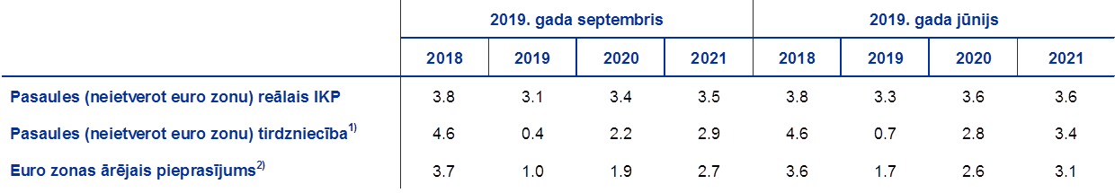Paredzams, ka vidējā termiņā pasaules ekonomiskā izaugsme paātrināsies un stabilizēsies līmenī, kas zemāks par tās ilgtermiņa vidējo rādītāju (3.8%). Paredzams, ka pēc pasaules (neietverot euro zonu) ekonomiskās izaugsmes palēnināšanās līdz 3.1% 2019. gadā (2018. gadā – 3.8%) tā paātrināsies un līdz 2021. gadam stabilizēsies 3.5% līmenī. Pasaules ekonomiskās izaugsmes norises nosaka trīs galvenie spēki. Pirmkārt, paredzams, ka attīstītajās valstīs cikliskais temps mazināsies, jo jaudas ierobežojumi kļūst arvien apgrūtinošāki (pozitīvas ražošanas apjoma starpības un zema bezdarba līmeņa apstākļos nozīmīgākajās attīstītajās valstīs), bet monetārās politikas atbalsts iespēju aplēšu perioda beigās pakāpeniski samazināsies. Otrkārt, paredzams, ka pakāpeniskā Ķīnas ekonomiskās izaugsmes palēnināšanās un līdzsvara maiņa, pārorientējoties no ieguldījumiem uz patēriņu, negatīvi ietekmēs pasaules ekonomisko izaugsmi un īpaši tirdzniecību. Treškārt, paredzams, ka pasaules ekonomisko izaugsmi balstīs tieši jaunās tirgus ekonomikas valstis (neietverot Ķīnu), tām atgūstoties no recesijas un to negatīvajai ražošanas apjoma starpībai arvien samazinoties. Salīdzinājumā ar 2019. gada jūnija iespēju aplēsēm pasaules ekonomiskās izaugsmes perspektīva iespēju aplēšu periodā pārskatīta un samazināta, atspoguļojot lēnāku, nekā gaidīts, atveseļošanos dažās jaunajās tirgus ekonomikas valstīs un – mazāk – ieilgušā tirdzniecības attiecību saspīlējuma ietekmi.