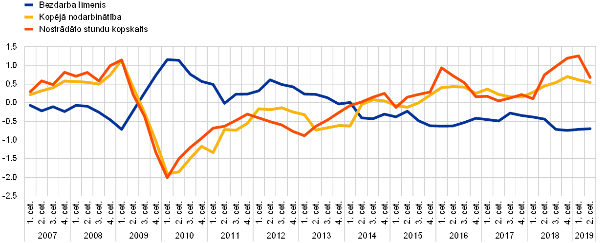 Piezīmes. Pozitīvs atlikums norāda, ka attiecīgais mainīgais sasniedzis augstāku līmeni, nekā paredz Oukena sakarība. Attēlā parādīti atlikumi attiecībā uz bezdarba līmeni, kā arī kopējās nodarbinātības un nostrādāto stundu kopskaita pieauguma tempu salīdzinājumā ar iepriekšējā gada atbilstošo periodu. Aplēšu pamatā ir dati par periodu no 1998. gada 1. ceturkšņa līdz 2019. gada 2. ceturksnim. Atlikumi iegūti, pamatojoties uz statisko Oukena sakarību, kas saista bezdarba līmeņa gada pārmaiņas, kopējās nodarbinātības gada pieauguma tempu un kopējā nostrādāto stundu skaita gada pieauguma tempu ar pašreizējā gada reālā IKP izaugsmes tempu.