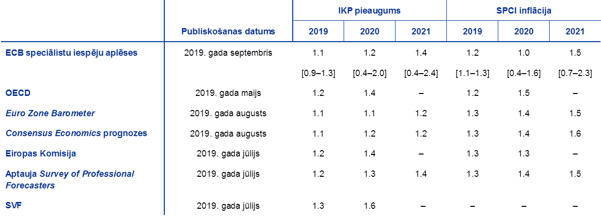 Avoti: OECD Tautsaimniecības perspektīvas, 2019. gada maijs; MJEconomics for the Euro Zone Barometer, 2019. gada augusta aptauja; Consensus Economics prognozes, 2019. gada augusta aptauja; Eiropas Komisijas Ekonomiskās prognozes, 2019. gada vasara, pagaidu Ekonomiskās prognozes; ECB Survey of Professional Forecasters (2019. gada 3. cet.); SVF Pasaules tautsaimniecības perspektīva, 2019. gada jūlijs.